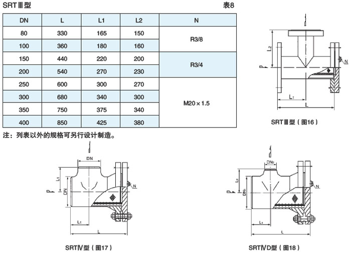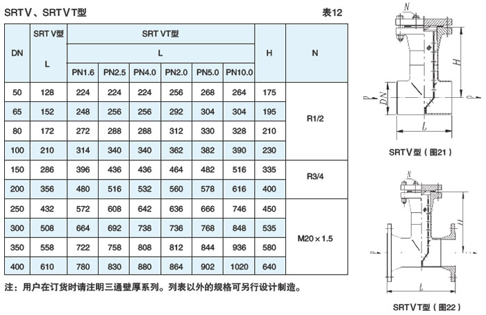 直通对焊(SRTⅤ型)、直通法兰(SRTⅤT型)连接式见图21、22,表12(DN50~400,PN≤10.0MPa)
