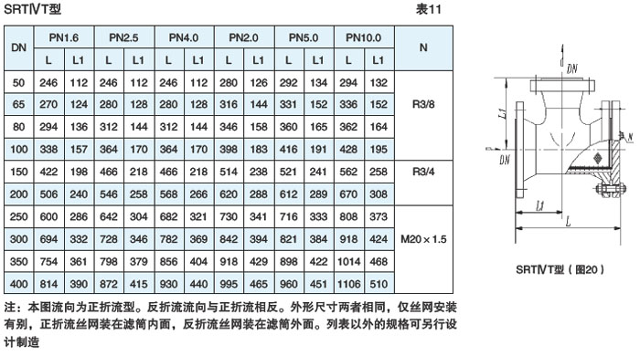 三通法兰连接式(SRTⅣT型)见图20、表11(DN50~400,PN≤10.0MPa)