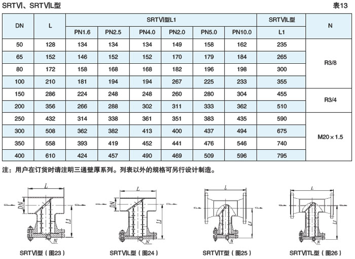 直流T型(SRTⅥ型)、直流T型加长(SRTⅥL型)对焊连接式见图23、24,表13(DN50~400,PN≤10.0MPa)