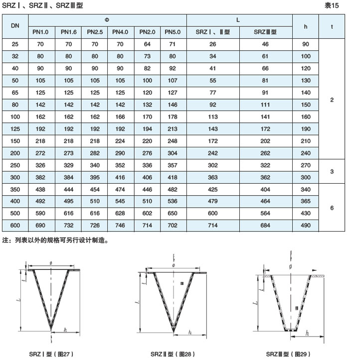 (1)锥形临时过滤器(SRZⅠ、SRZⅡ型)见图27、图28,表15(DN25~600,PN≤5.0MPa)