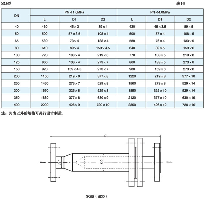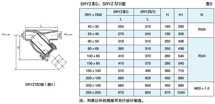 整体铸造异径法兰连接式(SRYZ ⅢD型)、异径对焊连接式(SRYZⅣD型)见图3、4,表3