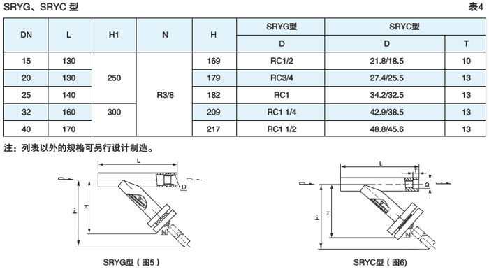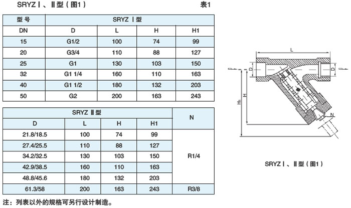 整体铸造螺纹连接式(SRYZⅠ型)、承插焊连接式(SRYZⅡ型)见图1、表1(DN15~50,PN≤4.0MPa)
