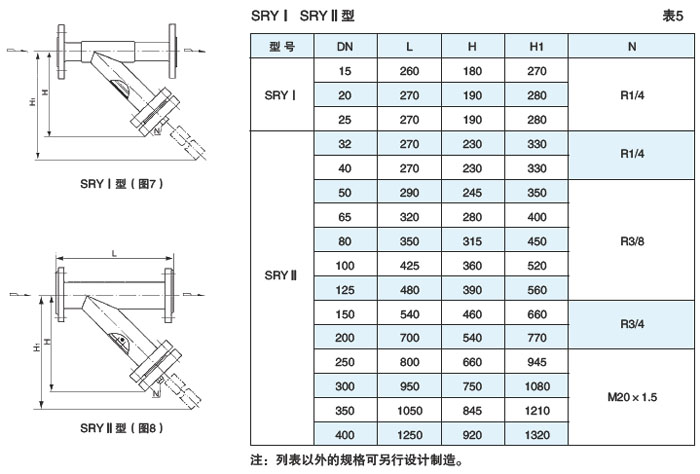 焊制法兰连接(SRYⅠ、SRYⅡ型)见图7、8,表5(DN15~400、PN≤5.0MPa)