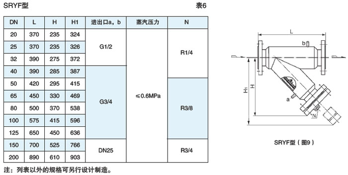 带夹套焊制法兰连接式(SRYF型)见图9、表6(DN20~200,PN≤5.0MPa)