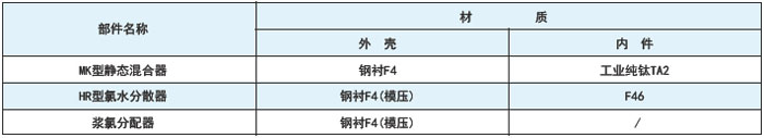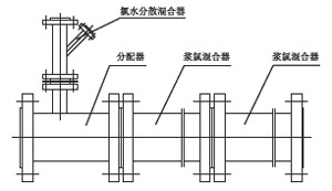 MR型氯水分散混合器是采用喷射器技术的小型设备,喷射水流的冲击将负压吸入的氯气粉碎分散成微细气泡,然后混合溶解于水中,生成基本均质的氯水混合物,再通过浆氯分配器的中和,与浆料一起进入MK型静态混合器进入快速混合。