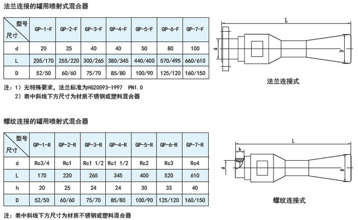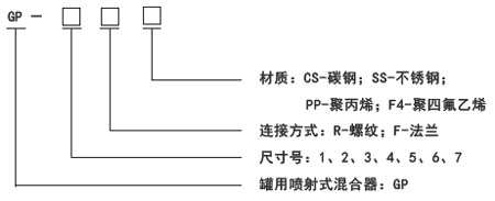 ● 如选择一台尺寸号为5,螺纹连接的聚丙烯GP系列罐用喷射式混合器,标注:GP-5-R-P